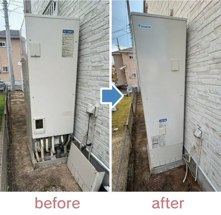 12年前に設置されたCHOFU製のエコキュートから、最新のダイキン「EQX46XFV」へ交換しました。