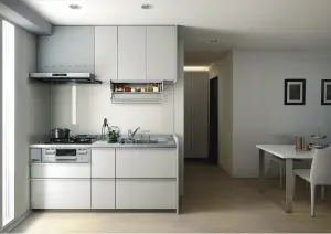 [間口180cm仕様について]コンロ用キャビネットにはらくパッと収納が設置できません。加熱機器は間口45cmのホーロートップコンパクトタイプのみの対応となり、レンジフードは間口75cmに変更になります。
